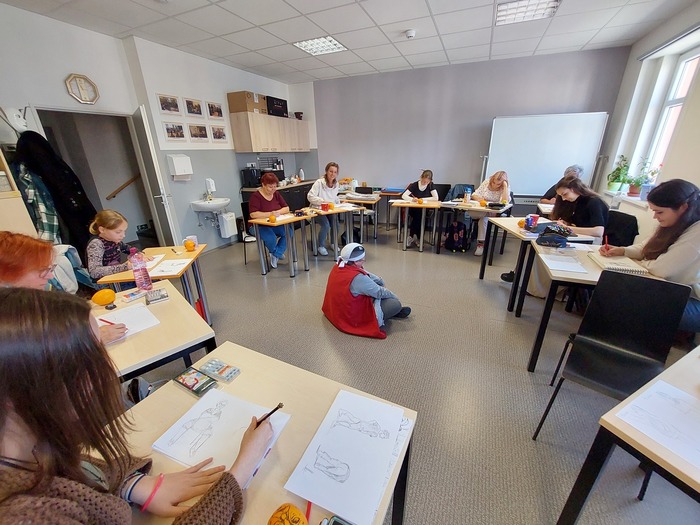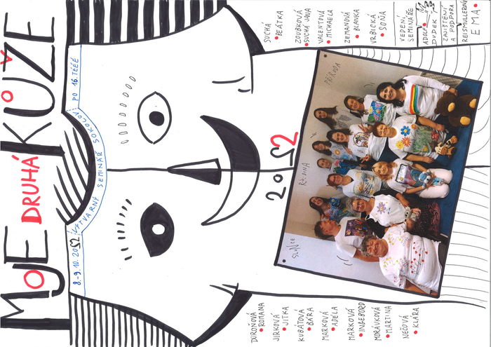 Po úvodním představení jak jinak než za pomoci kresby se všichni ponořili do světa barev a výtvarného tvoření. Čas věnovaný výuce výtvarné teorie byl prokládán rozmanitými výtvarnými aktivitami. Jen namátkou: malování na trika (to je ta druhá kůže), bláznivé koláže, kreslení na pomeranče… V neděli přálo počasí a tak jsme opět vyrazili do ulic za účelem zachytit postavy, které potkáme. Další tradicí semináře je konečný výstup – práce na dané téma. Tedy opět Moje druhá kůže. Posuďte sami, jak se letošní seminář vydařil – viz fotogalerie.